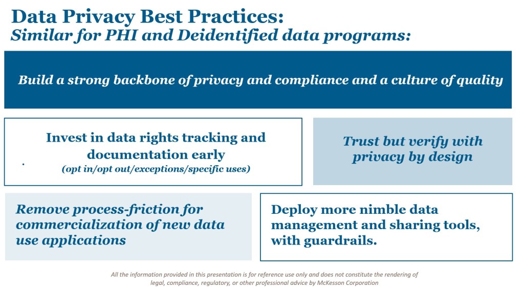 Whether dealing with PHI or deidentified data, success hinges on a common set of principles and practices. Based on industry experience, the following factors stand out: