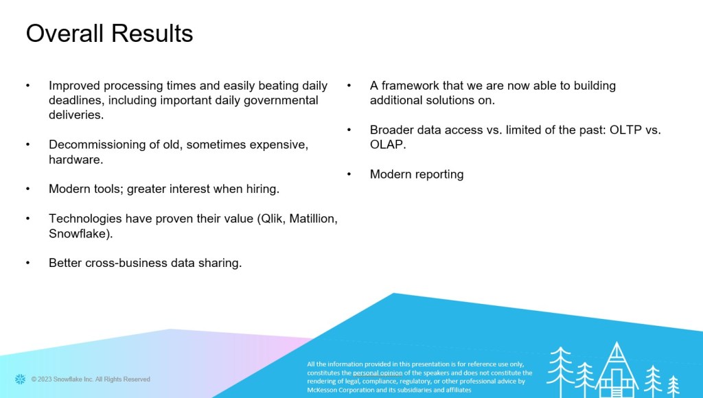 Below is a presentation given by my team at the Snowflake Summit 2023. This cloud data warehouse transformation project replatformed an 80-silo, 360+ TB Oracle data warehouse to Snowflake. Initial change data capture was implemented using Qlik’s Attunity product, and the team re-architected more than 1,100 queries and procedures in Matillion. Ongoing CI/CD was supported by DevOps through Jenkins.