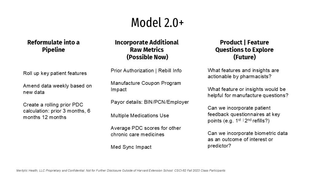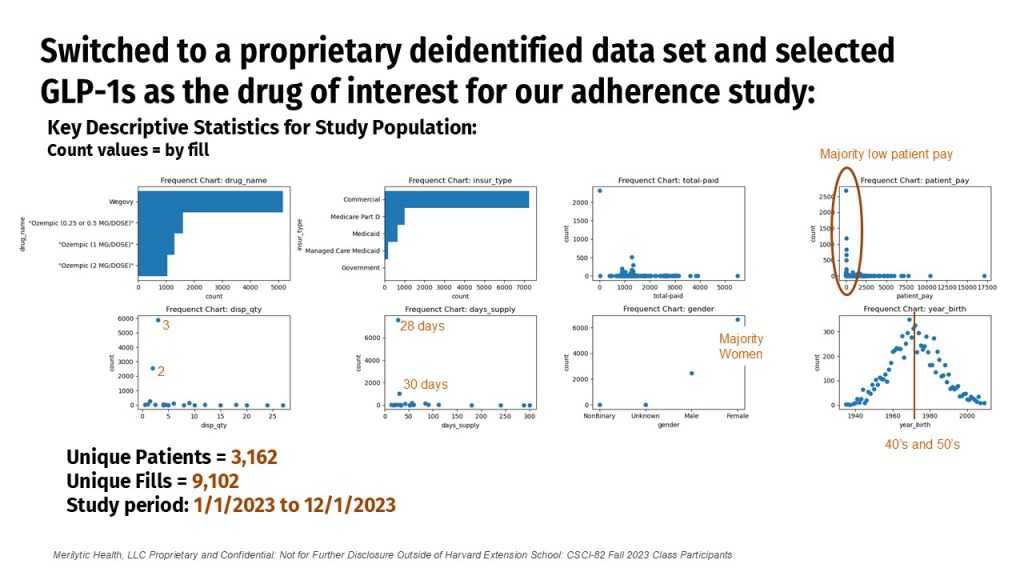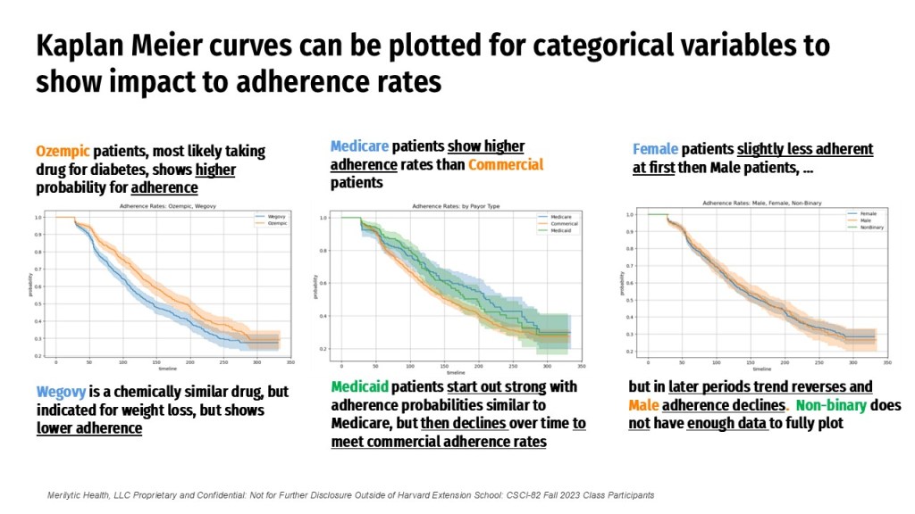 Initial Kaplan Meier and Cox Proportional hazard curves show a sharp drop in probability for survival after the first and second fills (approximately 30 and 60 days for a product that is dispensed in 28 and 30-days supply). Based on the time-dependent AUC curves for GLP-1s, we see our predicted adherence curves improve as the duration increases and we have more knowledge of patient behavior. In the future, introducing average patient compliance or structuring PDC scores in windows of previous compliance (3, 6, 12 month views) could also be used to demonstrate history prior to the study period and could help improve predictive capabilities earlier in the duration window. Finally, additional factors such as prior authorization status and loyalty program use could be interesting to see how or if they improve adherence, given that patient pay amount is a significant factor in predicting adherence.