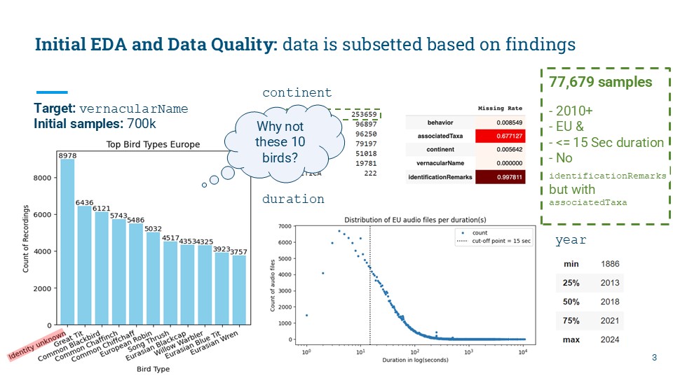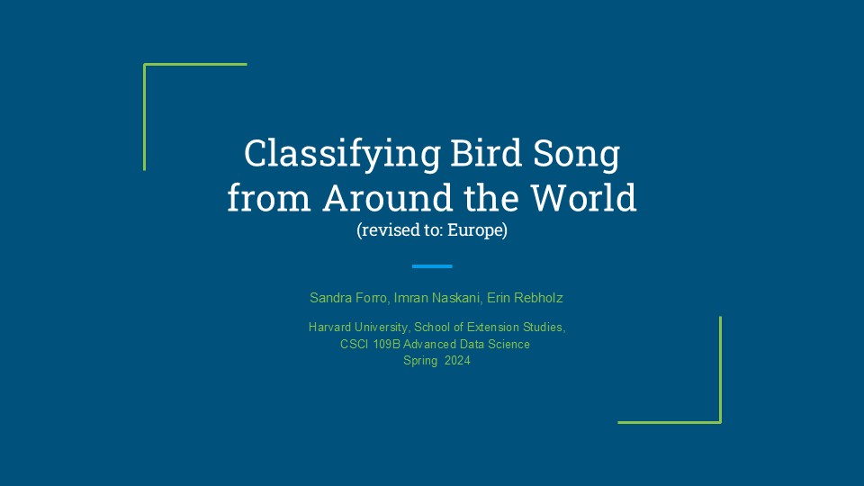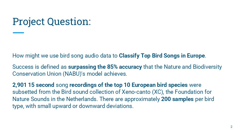 A hallmark of effective prediction applications is access to a large, high-quality dataset that captures the underlying dynamics and variables. Bird enthusiasts have been recording bird songs for decades, creating deep repositories of labeled audio data. These resources enable the development of models that can match new audio recordings to specific bird species. This project used a European dataset from Xenocanto to improve upon benchmark prediction accuracy traditionally achieved through manual identification.