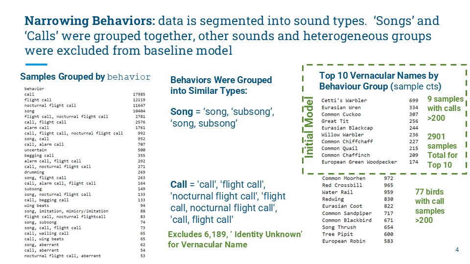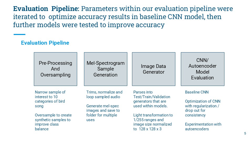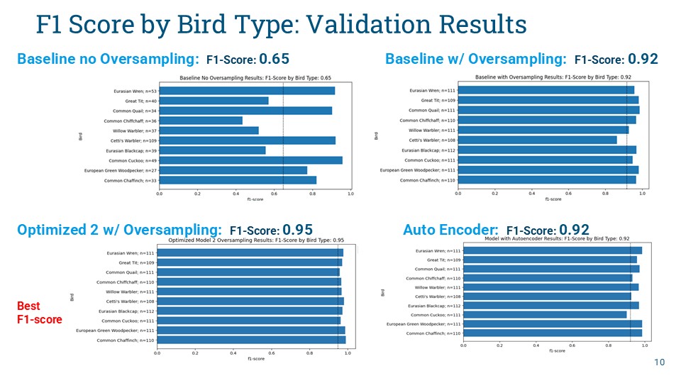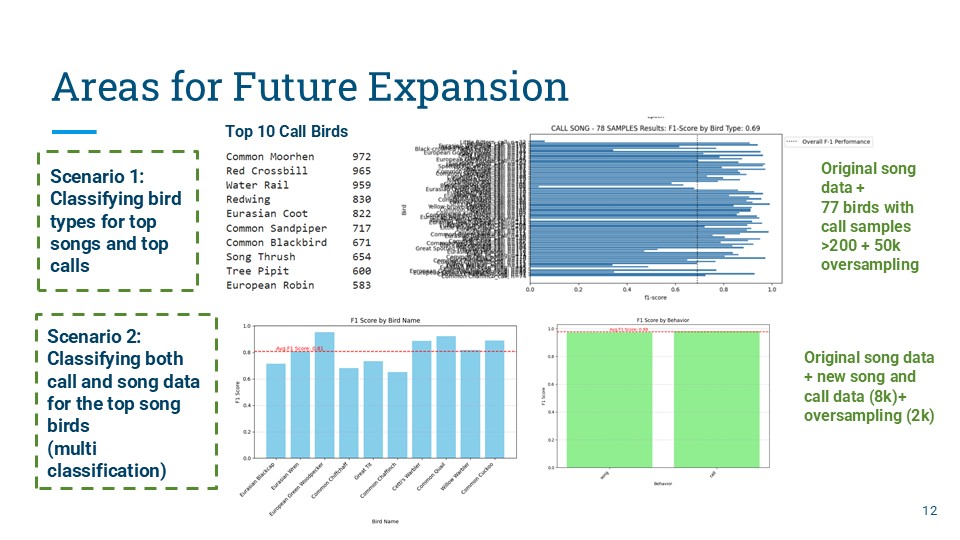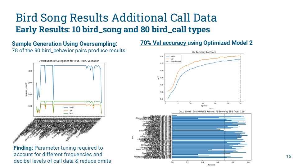 The team was able to achieve 95% validation accuracy for the Top 10 bird songs, surpassing the benchmark manural idenfication accuracy of 85%. The work was then extended to cover 78 bird songs and calls, with an intial accuracy of 70% and with further refinement possible to improve results. Finally, a multi-output neural networks was developed to predict not only bird species but also call type (song vs. call).
