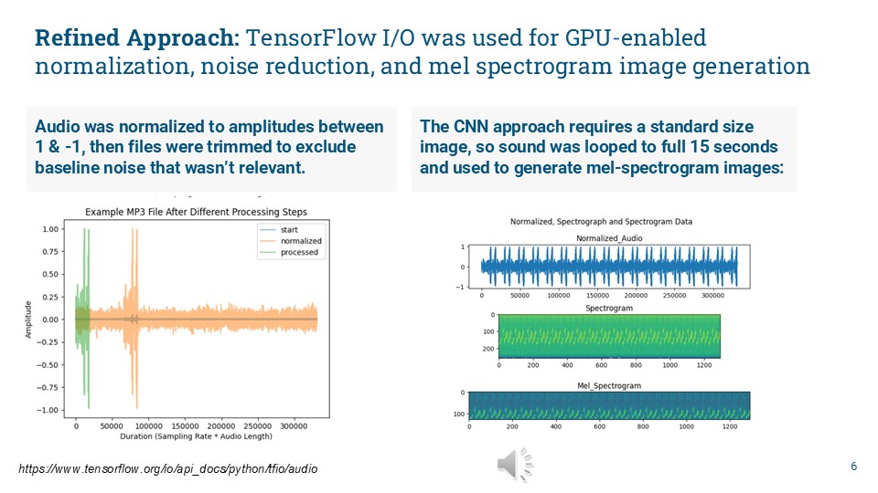 Although audio files are naturally represented as time-series data (suited for recurrent neural networks), they can also be transformed into images using Fast Fourier Transform (FFT). These spectrograms allow for more compact analysis with convolutional neural networks (CNNs). Audio data was segmented into uniform lengths, with silences removed and white noise filtered out. To address class imbalance and enrich the dataset, additional spectrograms were generated by varying FFT parameters. Multiple neural network architectures and techniques, including autoencoders, were tested and tuned to maximize predictive performance.