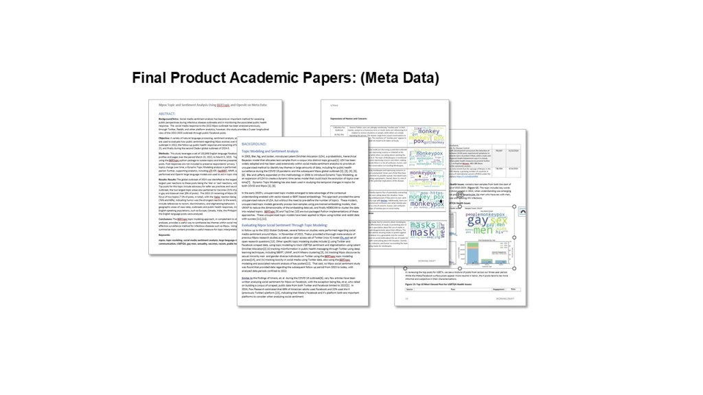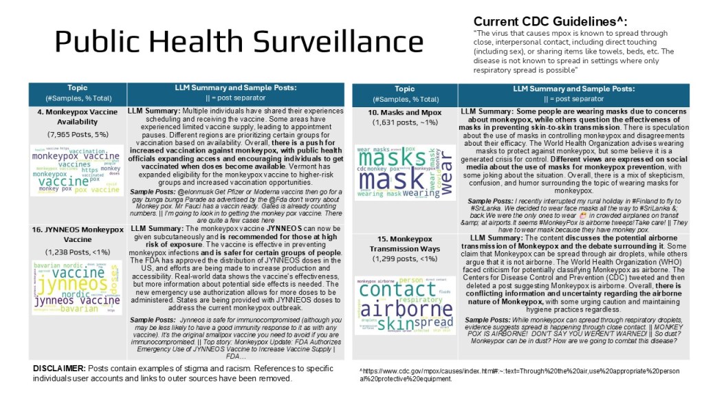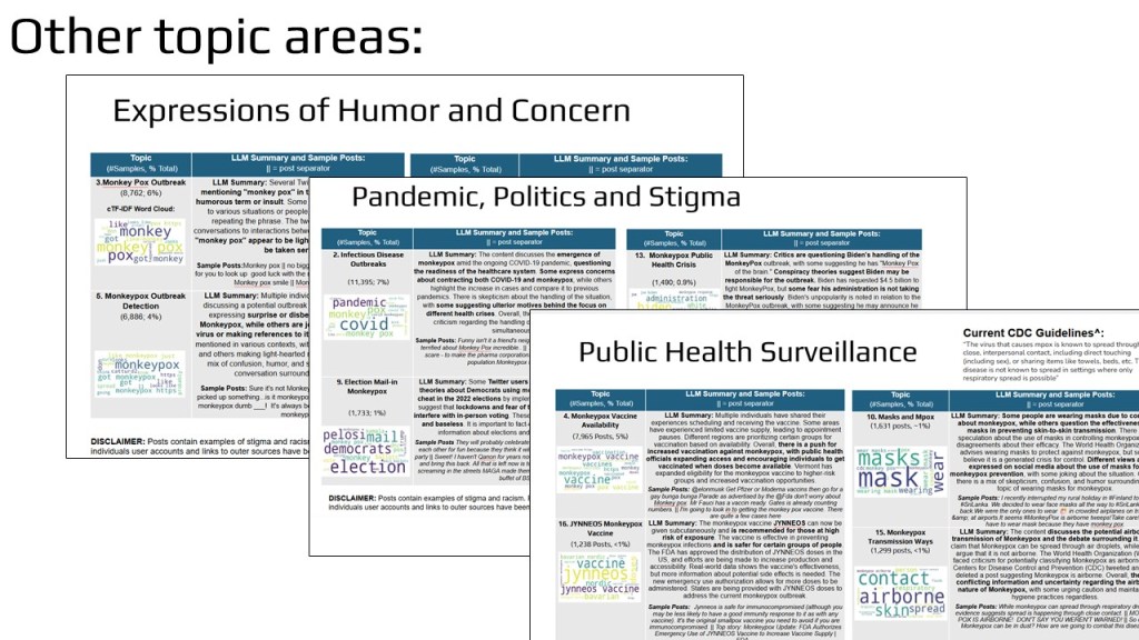 Approach: My contribution to the team’s work was to use unsupervised topic modeling to identify key themes in the Mpox outbreak and how they evolved from 2023-25. The work primarily used the BERTopic package in Python, which takes advantage of context-based vectors, pre-trained using the BERT transformer model, and then clustered the embeddings to identify themes that are contextually similar to one another. OpenAI’s ChatGPT was used to develop summary of the postings to better interpret the themes. Other members of the team explored use of LLMs to accurately predict sentiment based on hand labeled X, in a supervised modeling approach.