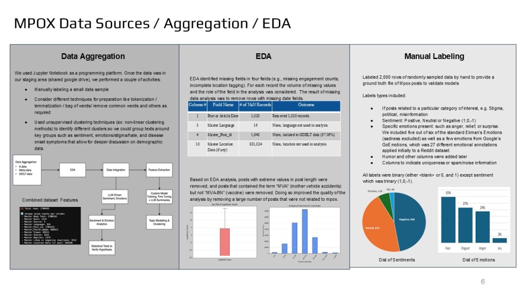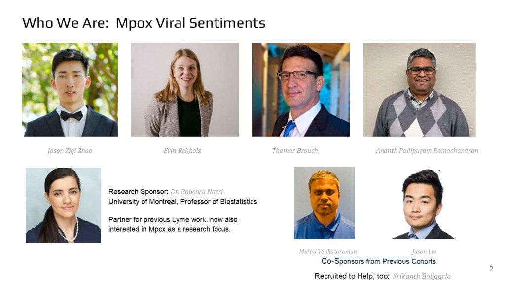 Project Overview: This project explored use of social media and news data (Meta, X, Reddit, Google News) and techniques to identify the changing social sentiment regarding Mpox, a viral disease that emerged as a global epidemic in 2022, with North American focus and again in summer 2024, within Africa. The team partnered with Dr. Bouchra Nasri from the University of Montreal and the project won the Dean’s Prize for best data science capstone.